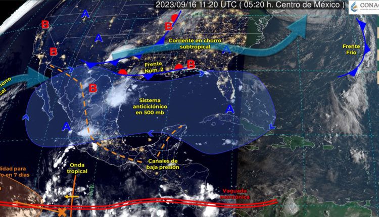 El monzón mexicano prevalecerá sobre el noroeste de la República Mexicana, propiciando lluvias fuertes a muy fuertes, descargas eléctricas y fuertes rachas de viento en Durango y Sinaloa, así como lluvias aisladas en Baja California Sur.