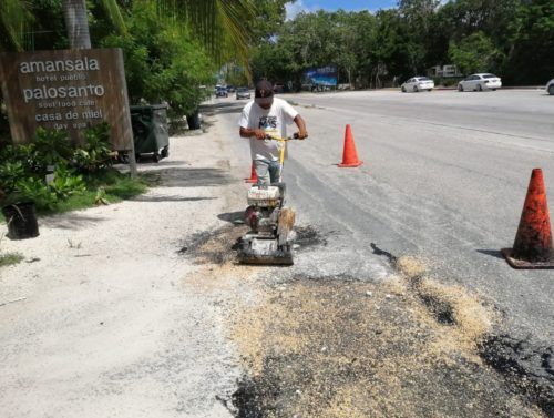 Tulum, Quintana Roo a 27 de septiembre a 2021.- Con el propósito de mejorar la imagen urbana y las vialidades, el Ayuntamiento de Tulum que preside Víctor Mas Tah, realiza una campaña de bacheo emergente a través de la cual se aplican 500 metros cuadrados de emulsión asfáltica para rehabilitar calles y avenidas.
