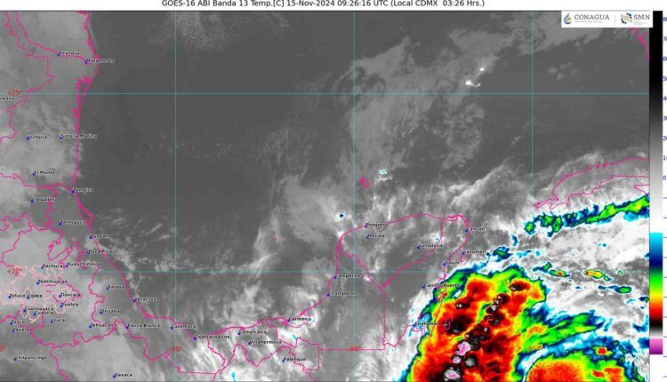 Simultáneamente, el frente frío número nueve se extiende sobre el Golfo de México, provocando vientos frescos del norte con rachas, descenso en la temperatura y lluvias acompañadas de actividad eléctrica en las zonas bajo su influencia.