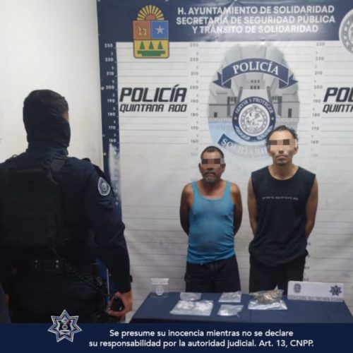 Policías del área Preventiva detuvieron a Alejandro “N” de 27 años de edad y a Eustaquio “N” de 56 años, procedentes de Chiapas en posesión de 3 envoltorios con posible marihuana y 34 con lo que parece metanfetamina, luego de ser vistos pasándose los envoltorios en el fraccionamiento Villas de Sol.