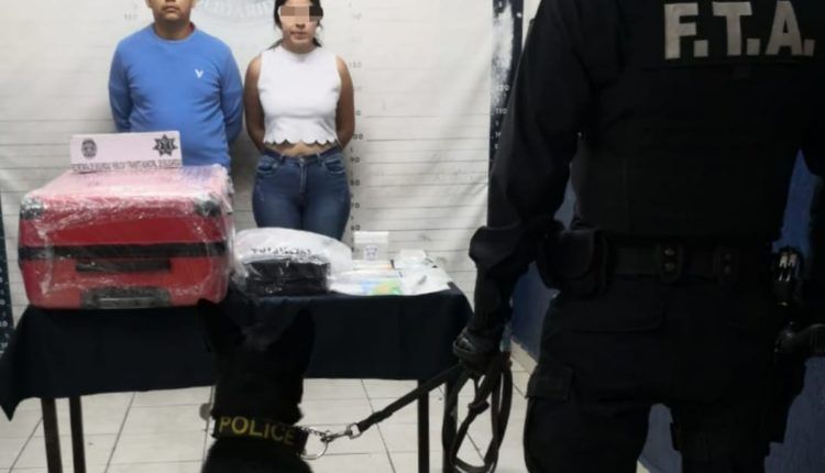 En la terminal de autobuses sobre la calle 12 y avenida 20 fueron asegurados Alex “N” de 25 años y Estefani “N” de 19 años, originarios de Tabasco, luego que un oficial canino de la Unidad K9 realizó un marcaje de alerta sobre sus pertenencias, encontrando un paquete con posible marihuana y otros objetos con sustancias a determinar.