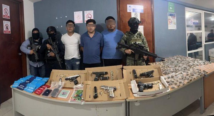Cancún, 21 septiembre del 2023 (Macropolis QR).- La Fiscalía General del Estado informa que, en coordinación con elementos del Ejército Mexicano, y tras una investigación de campo, gabinete y tecnológica, se logró la captura de Ovel Jovan “N”, David Fernando “N” y José Antonio “N” por su probable participación en delitos contra la salud en su modalidad de narcomenudeo y portación de armas de fuego de uso exclusivo del Ejército y Fuerzas Armadas en calles de Cancún.