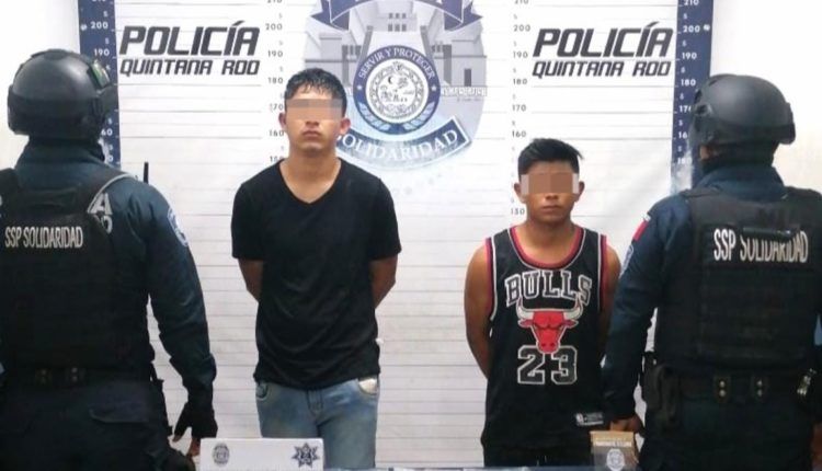 Playa del Carmen.- Policías de la Secretaría de Seguridad Pública y Tránsito Municipal de Solidaridad aseguraron a dos sujetos en posesión de posibles narcóticos en el fraccionamiento Villas Riviera.