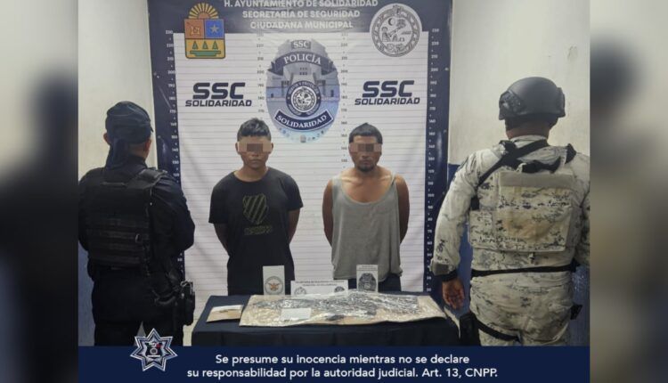 Playa del Carmen. – La Secretaría de Seguridad Ciudadana Municipal de Solidaridad y la Guardia Nacional aseguraron a 2 sujetos en posesión de una réplica de arma de fuego y un cartucho cuando circulaban a bordo de una motocicleta en la colonia In House.