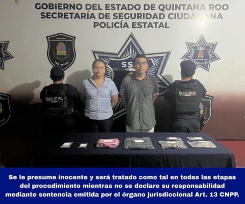Cancún.- En recorridos de vigilancia, elementos de la Secretaría de Seguridad Ciudadana, se percataron de dos personas, delante de ellos un vehículo estacionado con las intermitentes encendidas. Ambos estaban intercambiando múltiples bolsitas de plástico transparentes que en su interior contenían hierba verde y seca con las características a la marihuana.
