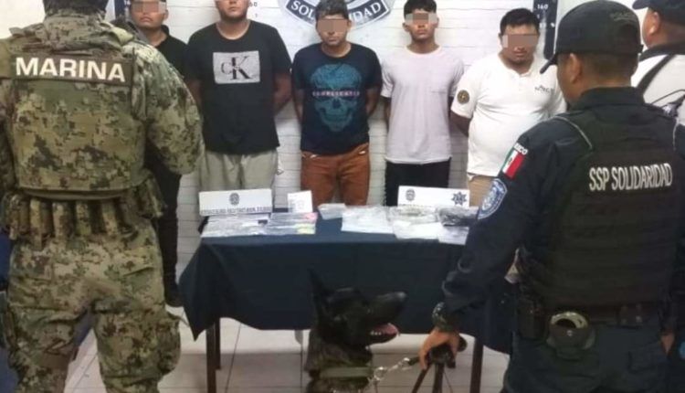Playa del Carmen.- En una acción de respuesta efectiva, policías de la Secretaría de Seguridad Pública y Tránsito Municipal de Solidaridad frustraron un intercambio de más de 90 posibles dosis de narcóticos y aseguraron a 5 sujetos durante el operativo de vigilancia permanente.