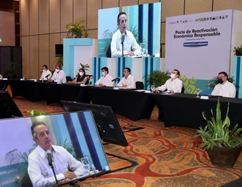 “Tenemos que estar pendientes día con día de lo que ocurre; estamos viendo en Europa, Sudamérica y Estados Unidos un repunte importante de casos que los ha llevado de nuevo al confinamiento; incluso dentro del país varios estados han regresado al color rojo, otros al naranja y algunos han tenido que tomar de nuevo medidas extremas para evitar un repunte”, agregó el gobernador ante todos los sectores de la sociedad reunidos en el hotel Moon Palace para sumarse al Pacto de Reactivación Económica Responsable.