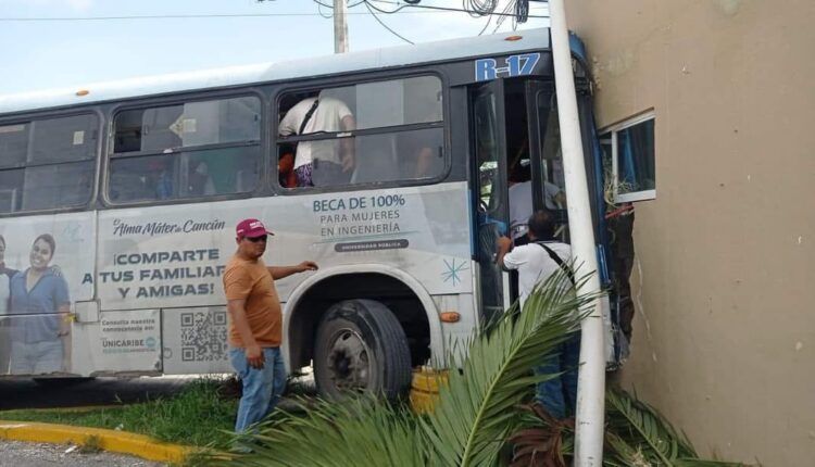 Cancún. – Un autobús de transporte público de la empresa Autocar se impactó esta mañana contra el muro de una gasolinera, cuando circulaba sobre la avenida Leona Vicario en la esquina de la avenida Kabah, esto en la Región 219 de esta ciudad.