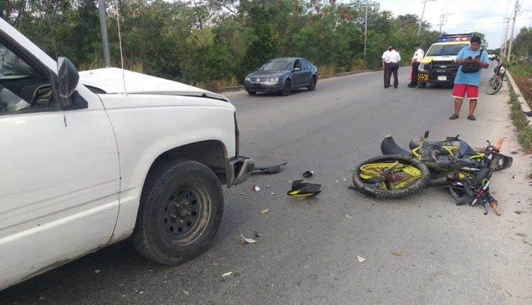 Cancún.- Un motociclista resultó gravente herido tras estrellarse de frente contra una camioneta.De acuerdo con las autoridades de Tránsito Municipal, el motociclista conducía en dirección a la avenida Rancho Viejo procedente de la avenida Kabáh, a bordo de su unidad mara Italika, color amarillo con negro, sin embargo, debido a que conducía a exceso de velocidad y en presunto estado de ebriedad, invadió el carril contrario y se impactó brutalmente contra la camioneta Chevrolet, color blanco, placas SZ-7162-J.