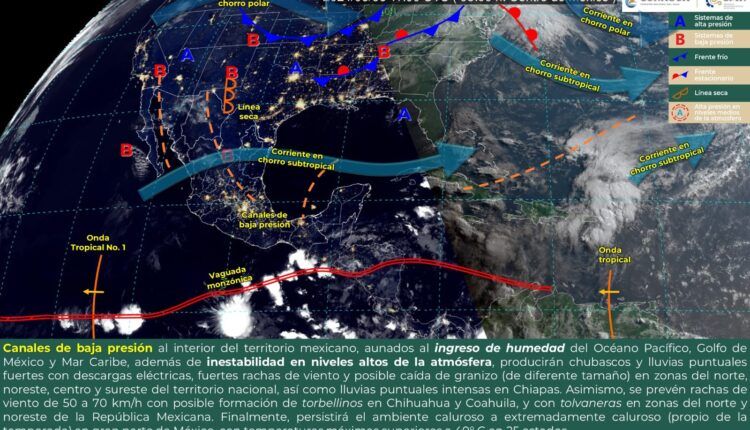 Canales de baja presión en el interior del país, aunados al ingreso de humedad que llegará del Océano Pacífico, Golfo de México y Mar Caribe, así como inestabilidad en niveles altos de la atmósfera, provocarán chubascos y lluvias puntuales fuertes acompañadas de descargas eléctricas, fuertes rachas de viento y posible caída de granizo (de diferente tamaño) en el norte, noreste, centro y sureste del país.