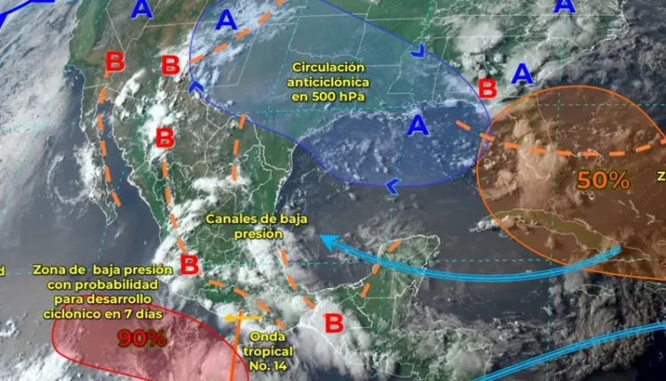La zona de baja presión con probabilidad de desarrollo ciclónico asociada a la onda tropical 14 se desplazará frente a las costas del Pacífico central mexicano, ocasionará lluvias puntuales intensas acompañadas de descargas eléctricas, rachas de viento y posible caída de granizo en Nayarit, Jalisco, Colima, Michoacán y Guerrero.