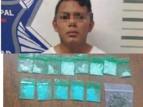 Los policías turísticos que realizaban rondines de vigilancia para la disuasión de delitos, atendieron el auxilio de un ciudadano que les indicó que un sujeto en estado inconveniente atacaba a los clientes del establecimiento, al llegar al lugar, se entrevistaron con el ahora detenido y al realizarle una inspección de seguridad encontraron entre sus pertenencias 5 bolsas con una sustancia sólida de las características de la droga conocida como cristal, 8 bolsas con polvo blanco al parecer cocaína y una bolsa con vegetal verde similar a la marihuana.