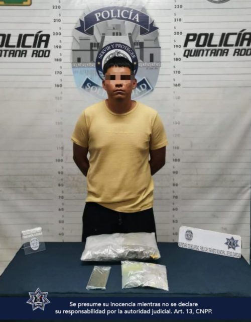 Playa del Carmen.- Al desplegar acciones de vigilancia en el fraccionamiento Los Olivos, la Policía Municipal de Solidaridad aseguró a una persona en posesión de posible marihuana y una sustancia a determinar, luego de sorprenderlo orinando en la vía pública.