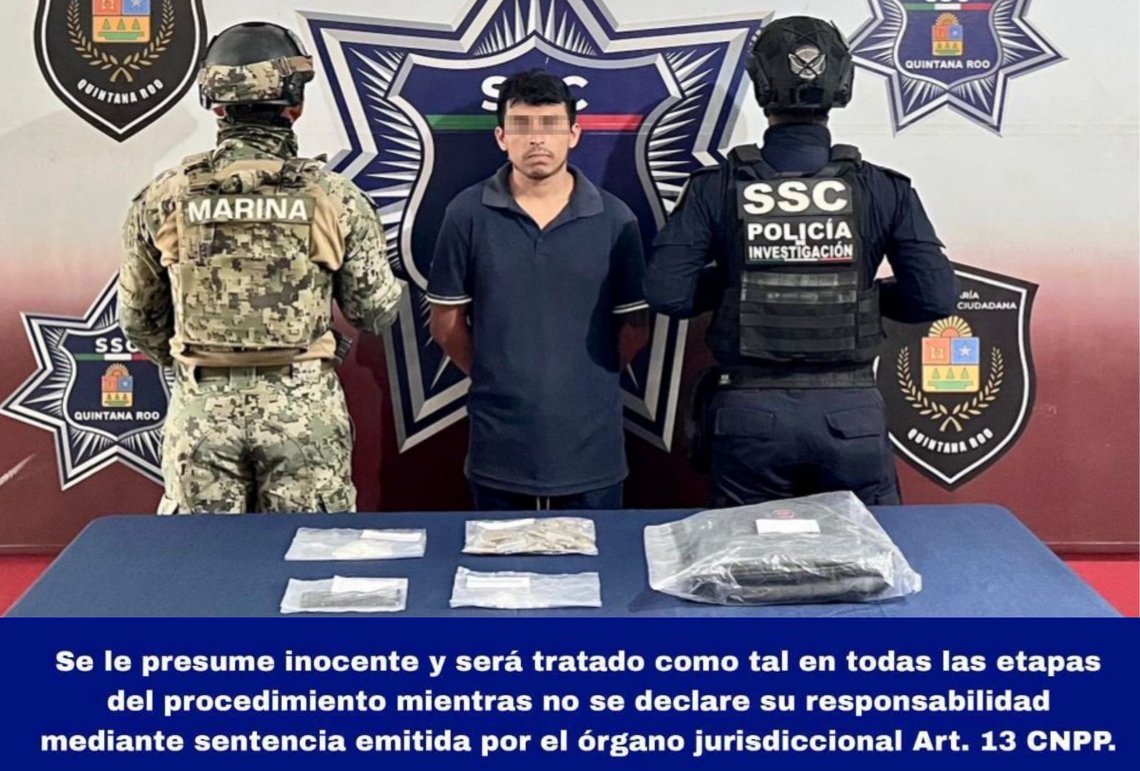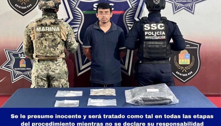 Cancún.- Durante recorridos de vigilancia orientados a la prevención del delito, elementos del Grupo de Investigación de la Secretaría de Seguridad Ciudadana en coordinación con personal de la Secretaría de Marina, visualizaron a un masculino que manipulaba bolsitas de plástico con aparente marihuana.