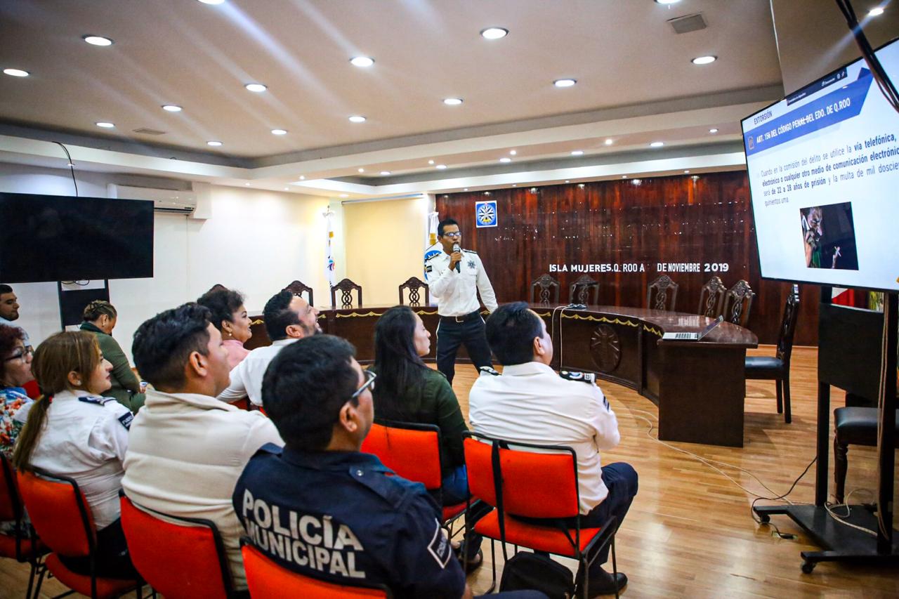 Isla Mujeres, Quintana Roo.- Con el objetivo de fortalecer la cultura de protección y autoprotección, el Gobierno Municipal de Isla Mujeres encabezado por Juan Carrillo Soberanis, a través de la Dirección General de Seguridad Pública y Tránsito Municipal (DGSPyTM) dirigida por Jaime Ongay Ortiz, llevó a cabo el taller “Prevención de la Extorsión y Fraude Telefónico” al personal del Ayuntamiento, en la Sala de Cabildo.