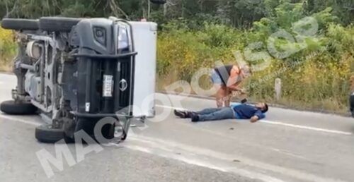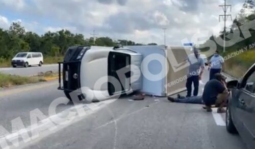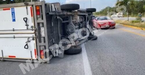 Playa del Carmen, Quintana Roo, 9 de febrero 2021.-Una camioneta tipo estaquitas se volcó en la carretera federal 307 a la altura de la terminal marítima de Punta Venado porque el chofer se quedó dormido cuando se dirigía a entregar tortillas a un hotel de la Riviera Maya.