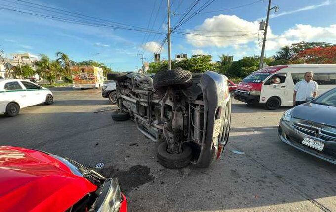Cancún. – El conductor de una camioneta terminó volcado en el cruce de las avenidas Chac Mool y Los Tules, tras volarse un alto y ser impactado por otro vehículo, la mañana de hoy viernes.