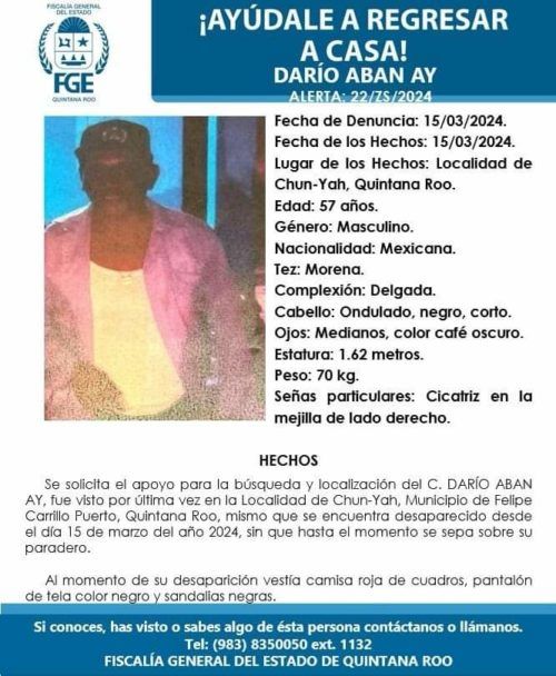 La primera persona desaparecida es Darío Aban Ay, de 57 años de edad, quien vestía una camisa roja de cuadros, pantalón negro y sandalias negras al momento de su desaparición. Se describe como tez morena, delgado, cabello ondulado y negro, ojos cafés oscuros, con una estatura de aproximadamente 1.62 metros y un peso de 70 kilogramos. Tiene una cicatriz en la mejilla derecha.