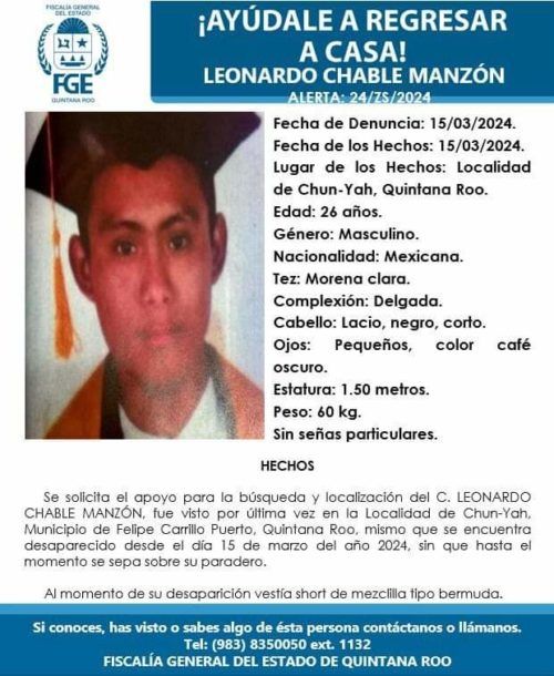 La tercera persona desaparecida es Leonardo Chablé Mazón, de 26 años, quien vestía un short de mezclilla tipo bermuda. Se describe como tez morena clara, delgado, cabello negro y lacio, ojos oscuros y pequeños, con una estatura de 1.50 metros y un peso de aproximadamente 60 kilogramos. No tiene señas particulares.