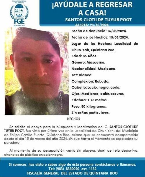 La segunda persona desaparecida es Santos Clotilde Tuyub Poot, de 35 años, quien no llevaba camisa, vestía un short deportivo y chanclas negras de plástico. Se describe como tez blanca, robusto, cabello negro y lacio, ojos cafés oscuros, con una estatura de 1.75 metros y un peso de aproximadamente 80 kilogramos. No tiene señas particulares.