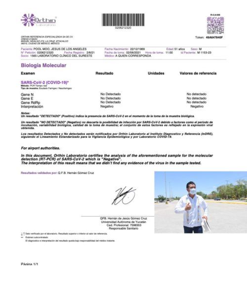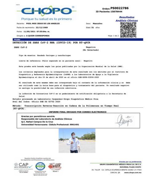 Cancun, a 2 dejunio de 2021.- Como parte de su compromiso con la sociedad para mantener la salud y el bienestar con las familias de Benito Juárez, el candidato común por el PAN-PRD-Confianza por Quintana Roo, Chucho Pool, se realizó hoy una prueba PCR para detección del SARS-COVID 19, la cual resultó NEGATIVA.