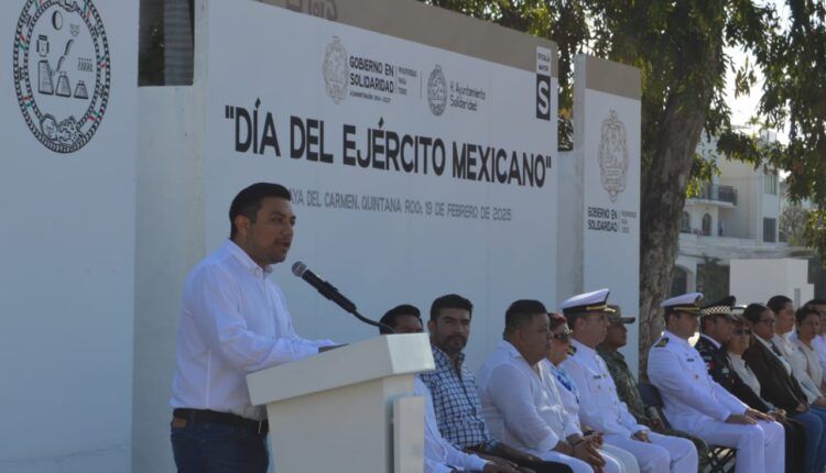 Playa del Carmen.— Con una ceremonia cívica realizada en la Explanada 28 de Julio, donde se dieron cita autoridades civiles y militares, el gobierno de Solidaridad, por medio de la Oficialía Mayor, conmemoró el Día del Ejército Mexicano.