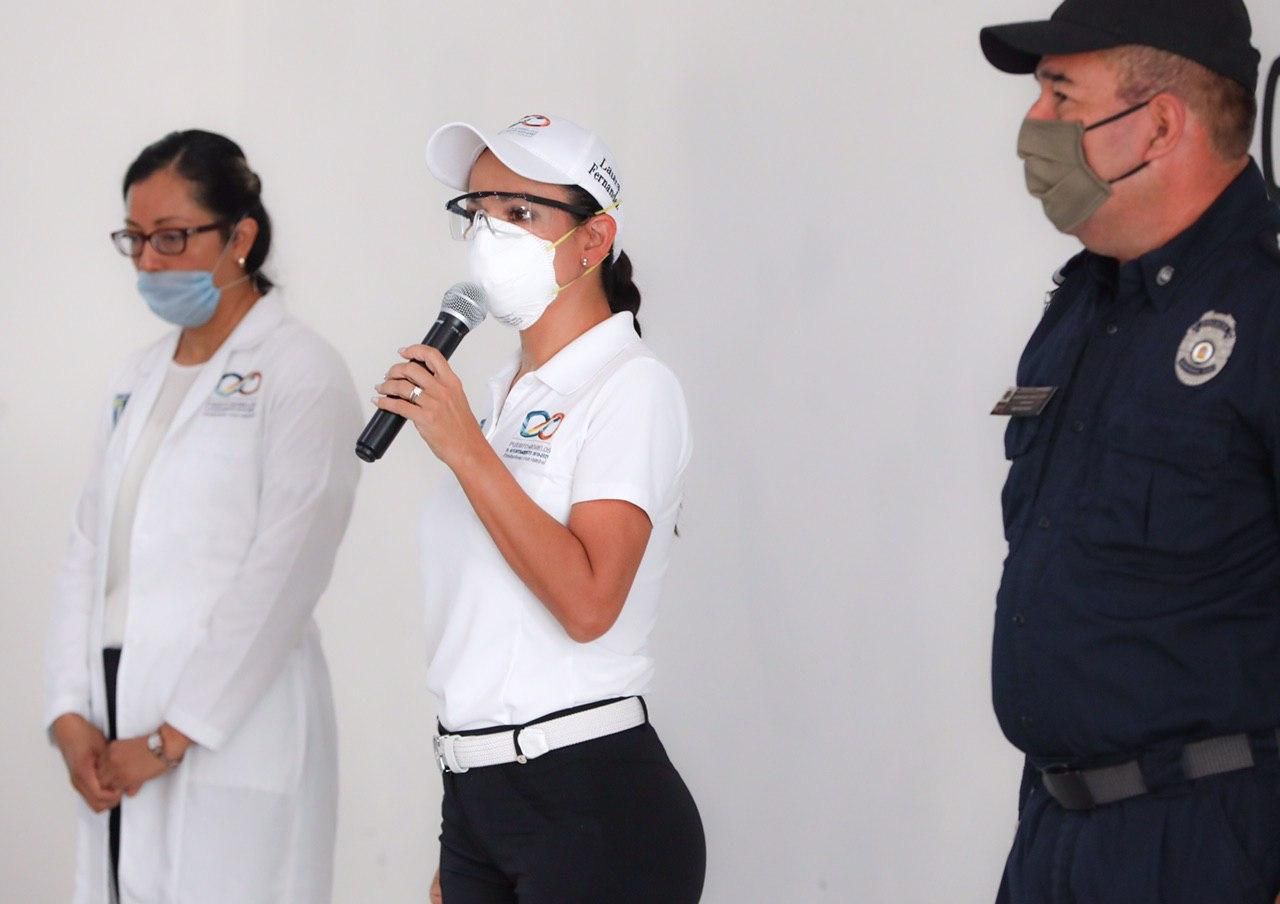 Puerto Morelos, Quintana Roo, 16 de abril de 2020.- La alcaldesa Laura Fernández Piña constató esta mañana los protocolos de sanidad que se llevan a cabo en la Secretaría municipal de Seguridad Pública y Tránsito durante los cambios de turno, como parte de las medidas de prevención ante la pandemia del coronavirus (Covid-19).