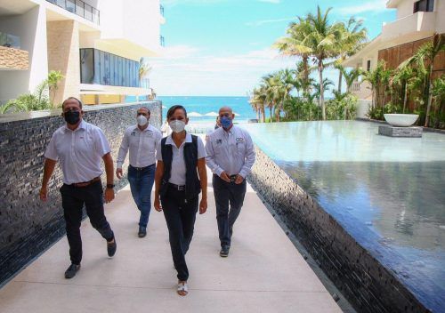 La alcaldesa, quien estuvo acompañada por los secretarios de Desarrollo Económico y Turismo, Héctor Tamayo Sánchez, y de Desarrollo Urbano y Ecología, Tirso Esquivel Ávila, visitó el recién abierto hotel The Fives Oceanfront Puerto Morelos, en el que los empleados siguen rigurosas medidas de prevención durante toda su jornada laboral.