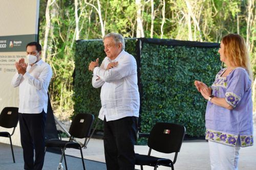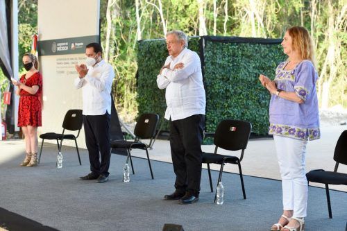 También acompañaron al presidente: su esposa, Beatriz Gutiérrez Mueller; el gobernador de Campeche, Carlo Miguel Aysa González; el gobernador de Yucatán, Mauricio Vila Dosal; el presidente municipal de Calkiní, Roque Jacinto Sánchez Golib; el presidente municipal de Halachó, Rodolfo Castillo Huchim; el supervisor honorario de Tren Maya, Daniel Chávez Morán; el director general de Grupo Carso, Antonio Gómez García; el director de Indi México, José María Martínez Benavente y la directora general de ICA, Guadalupe Phillips