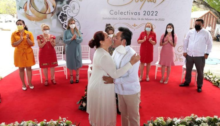 Playa del Carmen.- En total 250 parejas de Playa del Carmen y Puerto Aventuras contrajeron matrimonio este 14 de febrero durante las Bodas Colectivas 2022, en el marco del Día del Amor y la Amistad.