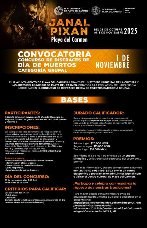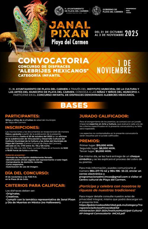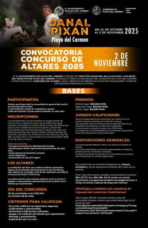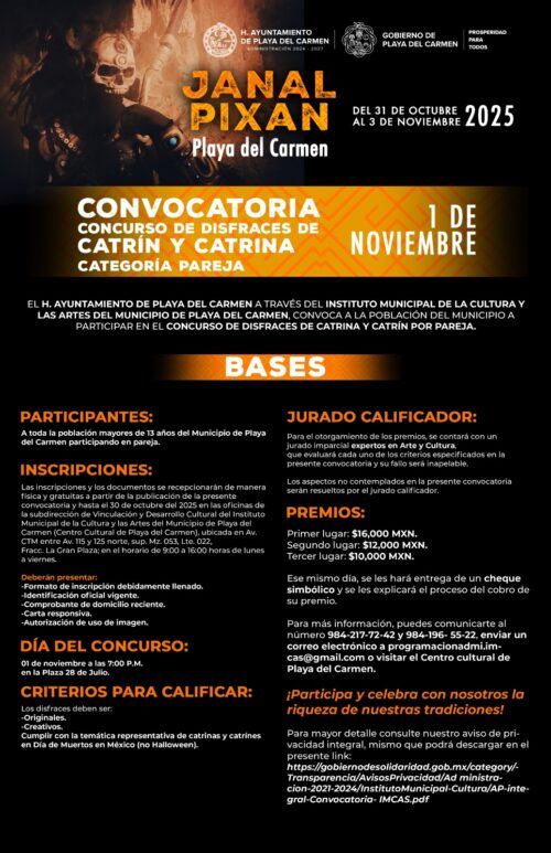 Playa del Carmen.- El Instituto Municipal de la Cultura y las Artes de Playa del Carmen invitó a las familias playenses a participar en los diversos concursos que se llevarán a cabo en el marco de las festividades del Janal Pixan 2025, con una bolsa en premios de casi 200 mil pesos.