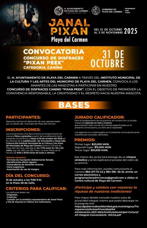 Por lo que toca al concurso de disfraces “Pixan Peek” categoría canina, se realizará el 31 de octubre en la Plaza 28 de Julio y tendrá un primer premio de 20 mil pesos.