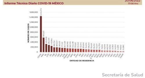 El top 10 lo completan Guanajuato (285 mil 329 casos), Jalisco (249 mil 964), Tabasco (189 mil 627); San Luis Potosí (189 mil 627), Veracruz (183 mil 031), Puebla (171 mil 561) y Sonora (167 mil 538).
