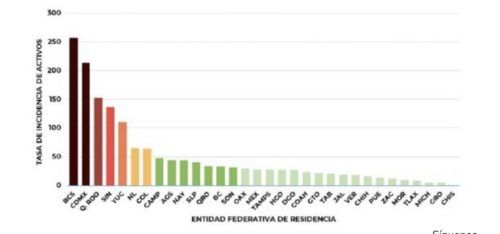 La tasa de casos activos de COVID-19 por cada 100 mil habitantes, pone en los primeros 10 lugares a los siguientes estados:
