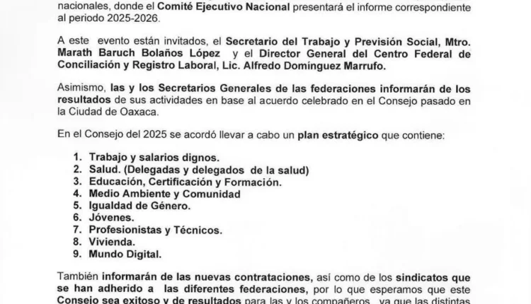 El encuentro contará con la participación de delegaciones de las 32 federaciones estatales, sindicatos nacionales y miembros del Comité Ejecutivo Nacional, quienes presentarán el informe correspondiente al periodo 2025–2026.