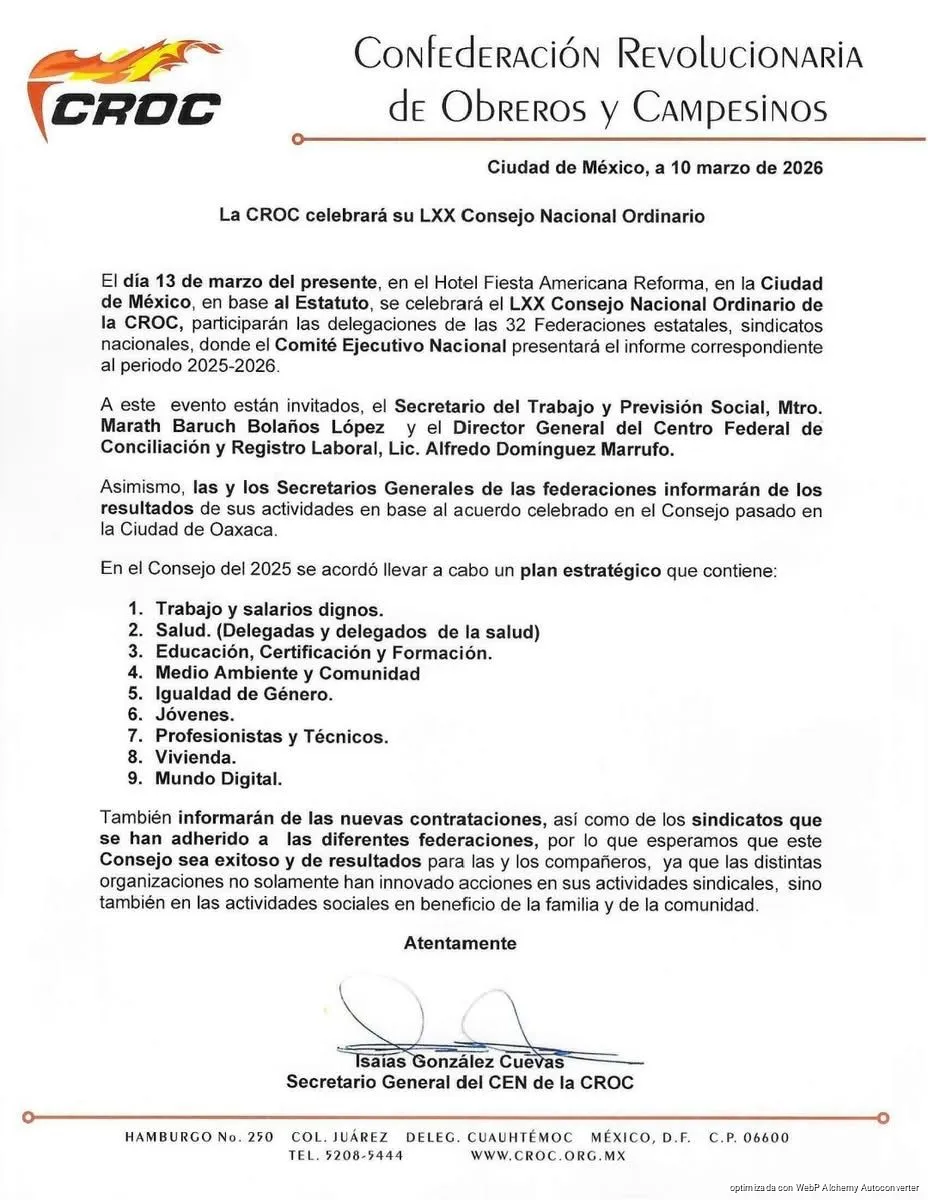 En el documento firmado por Isaías González Cuevas, secretario general del Comité Ejecutivo Nacional de la CROC, se señala que el consejo busca consolidar acciones sindicales innovadoras y fortalecer las actividades sociales en beneficio de las familias trabajadoras y sus comunidades.
