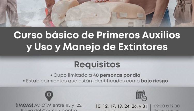 Playa del Carmen.-Este 10, 12, 17, 19, 24, 26 y 31 de mayo, se impartirá el Curso básico de Primeros Auxilios y Uso de Extintores en las instalaciones del (IMCAS) ubicado en ave. CTM entre 115 y 125, Playa del Carmen, contra esquina de Plaza las Américas.