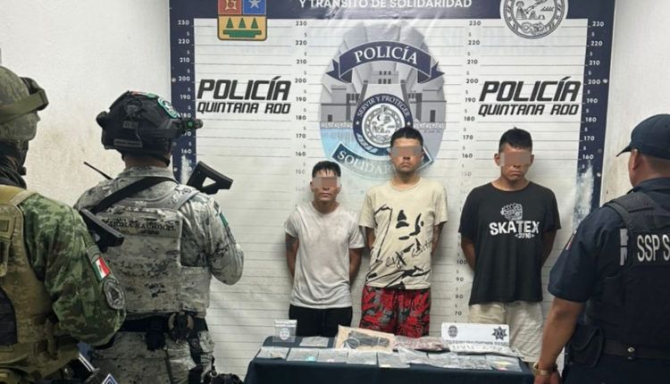 Playa del Carmen, 12 octubre del 2023 (Macropolis QR).- La Policía Municipal de Solidaridad avanza en la lucha contra el narcomenudeo con acciones como la detención de 3 sujetos, el aseguramiento de un arma de fuego y posibles dosis de drogas como metanfetamina y marihuana en la colonia Centro.