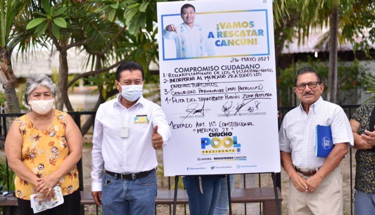 Cancun, a 26 de mayo de 2021.- Con el respaldo total de los más de 200 locatarios del mercado Artículo 115 Constituciona, conocido popularmente como “mercado 28”, Chucho Pool, candidato de PAN-PRD y Confianza por Quintana Roo a la presidencia municipal de Benito Juárez, se comprometió a promover el sitio , reencarpetar sus cuatro estacionamientos, brindar mayor seguridad, mejorar el servicio de recolección de basura y restablecer la ruta de transporte público de la zona hotelera hacia este emblemático lugar con casi 40 años de vida, para que el turismo llegue directamente.