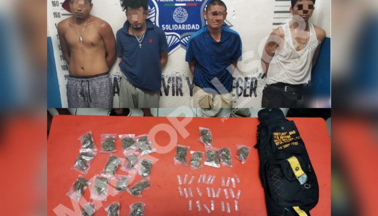 Playa del Carmen, Solidaridad a 20 de octubre de 2021.- Policías de la Secretaría de Seguridad Pública de Solidaridad en coordinación con la Secretaría de la Defensa Nacional y la Secretaría de Seguridad Pública Estatal a través del operativo para la Construcción de Paz y Seguridad en Quintana Roo, aseguraron a cuatro sujetos en posesión de 49 dosis de diversos narcóticos en la colonia Colosio.
