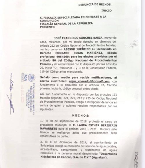 Interponen denuncia penal ante la Fiscalía Especializada en Combate a la Corrupción de la Fiscalía General de la República (FGR) contra la presidenta municipal de Solidaridad, Laura Beristain Navarrete por utilizar recursos federales y del municipio para favorecer a la concesionaria Desarrollos Hidráulicos Aguakan