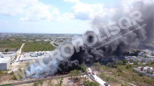 Playa del Carmen, a 13 de mayo de 2021.-Derivado de una quema de llantas que se salió de control se registró fuerte incendio en un predio ubicado sobre la avenida jacinto pat con avenida sian kaan.