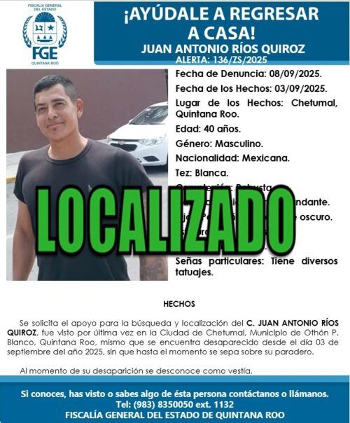 Chetumal.– La Fiscalía General del Estado informa que fueron localizadas con vida seis personas originarias del estado de Nayarit, reportadas como desaparecidas tras una presunta privación ilegal de la libertad ocurrida en un hotel de la capital del estado.