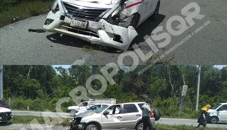 Playa del Carmen, a 18 de julio de 2021.- Apararoso accidente de tránsito se registró esta tarde sobre tramo federal a la altura de Punta Venado, donde se vieron involucrados tres vehículos, entre ellos un taxi de Tulum, el saldo fue de cuatro personas heridas y cuantiosas pérdidas materiales.