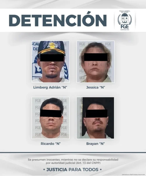 El cateo se realizó en un domicilio ubicado en la Supermanzana 46, sobre avenida Bacalar, donde fueron detenidos Limberg Adrián “N”, Ricardo “N”, Jessica “N” y Brayan “N”.