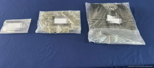Durante la revisión, se le aseguraron 49 bolsitas con presunta marihuana y 17 más con fragmentos sólidos similares al cristal, además de una mochila.