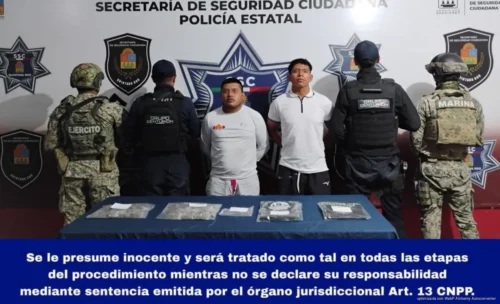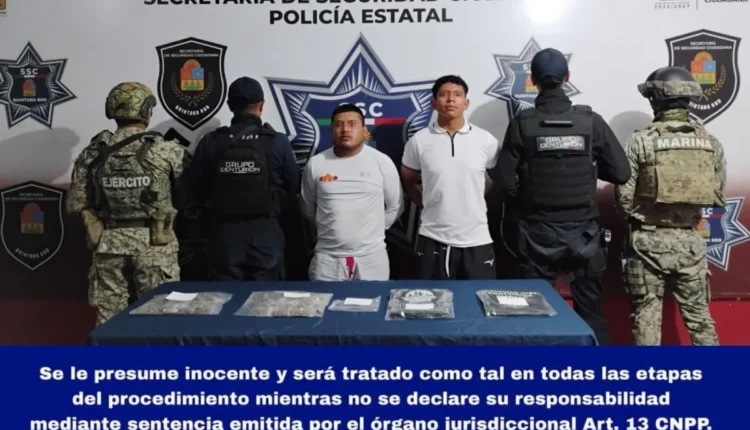 Los detenidos fueron identificados como Mario Rubén “N” y Ángel de Jesús “N”, quienes fueron sorprendidos manipulando diversas bolsitas con vegetal verde con características similares a la marihuana.