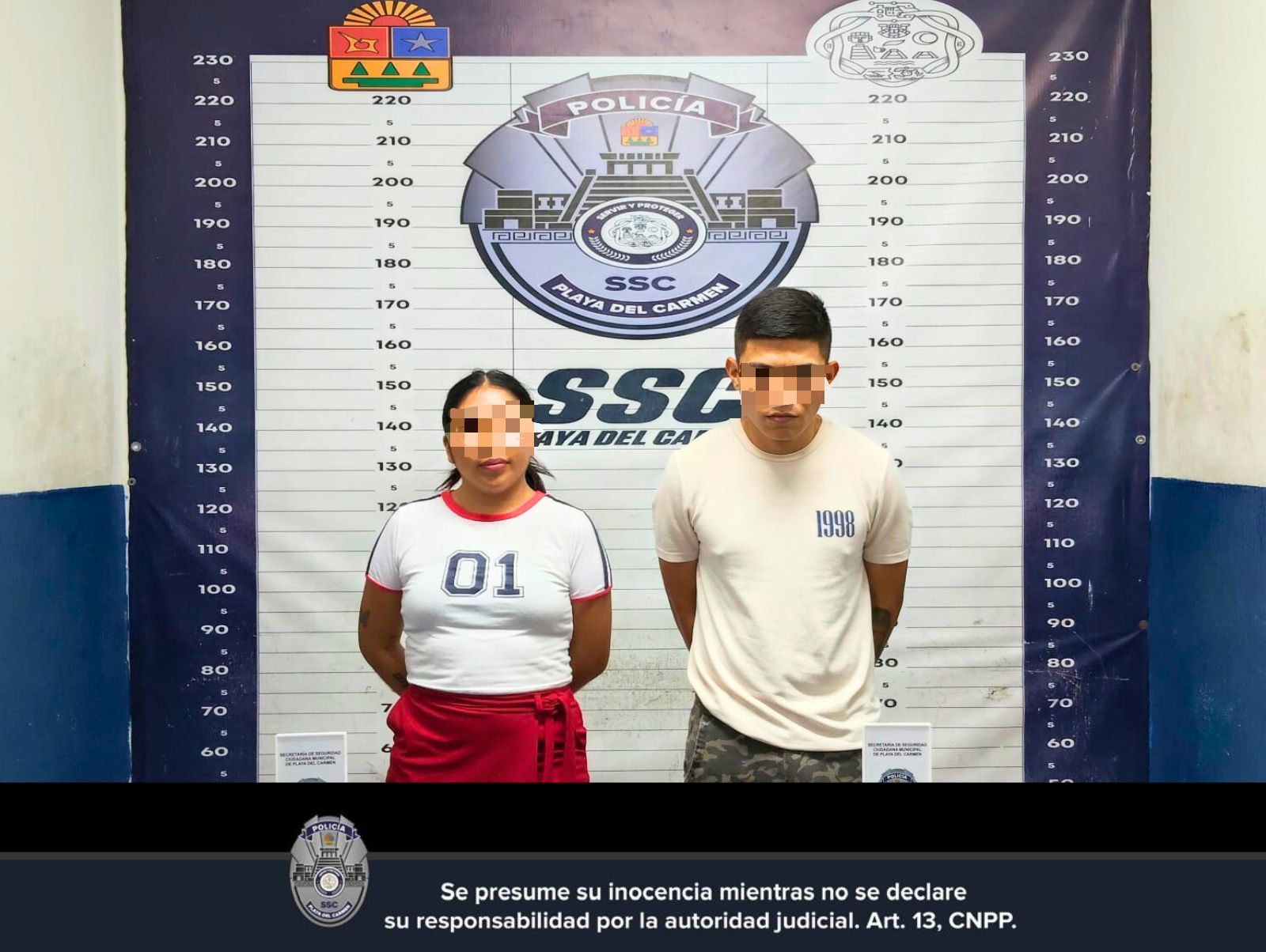 Los asegurados fueron identificados como Jhovani “N”, de 24 años y originario de Cancún, y María José “N”, de 25 años, originaria de Yucatán. Ambos se desplazaban a bordo de un Volkswagen color azul, con placas de Quintana Roo, cuando el ejemplar canino certificado realizó marcaje positivo, lo que motivó la revisión del automóvil.