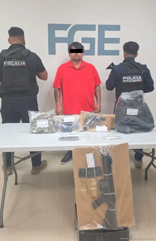 Minutos después, en una acción distinta en la colonia Misión de las Flores, específicamente sobre la avenida Lilis, entre Flor de Durazno y Linos, los agentes sorprendieron a Martín de Jesús “N” intercambiando bolsas con otro sujeto, quien escapó a bordo de una motocicleta. En la inspección, los policías aseguraron varias dosis de presuntos narcóticos, un arma larga calibre .233 mm, un arma corta 9×19 mm, además de dos cargadores y municiones.