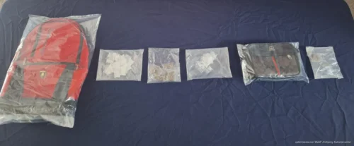 Tras marcarles el alto y realizar una revisión preventiva, los agentes aseguraron seis bolsitas con hierba seca, 50 bolsitas con fragmentos sólidos cristalinos con características similares al cristal, además de una pechera color negro y una mochila roja.